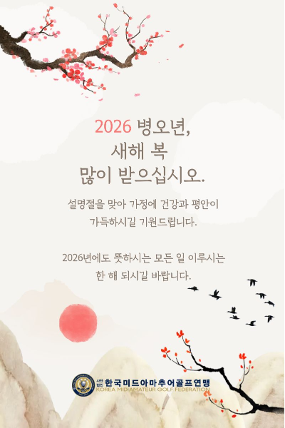KMAGF NEWS KMAGF의 새로운 소식을 확인하세요. 더보기 2026년도 대한골프협회 회원총회 공로패 수상 2026-01-29 2025년도 한국미드아마추어골프연맹 아마랭킹 TOP10 2025-10-29 KMAGF NOTICE KMAGF의 공지사항을 확인하세요. 더보기 2023년 골프 규칙에 대한 추가 설명 (2026년 1월 업데이트) 2026-01-14 제2회 아티타야배 레이디스 미드아마 챔피언십 & LX 제16회 KMAGF 미드아마 챔피언십 갤러리 허용에 관한 안내 2025-10-16