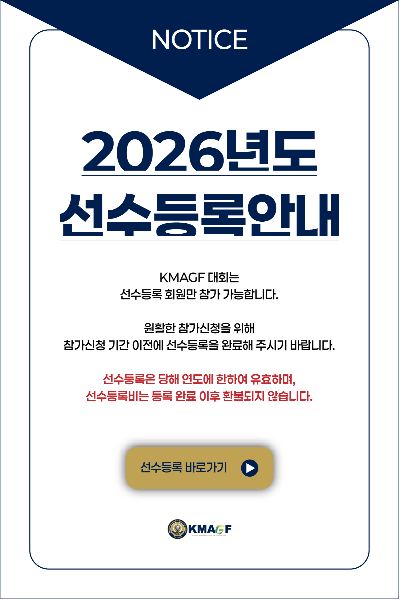 KMAGF NOTICE KMAGF의 공지사항을 확인하세요. 더보기 2026년 선수등록비 납입 안내 2026-03-19 KMAGF 2026 시즌 대회 일정 공개 및 선수등록 안내 2026-03-16
