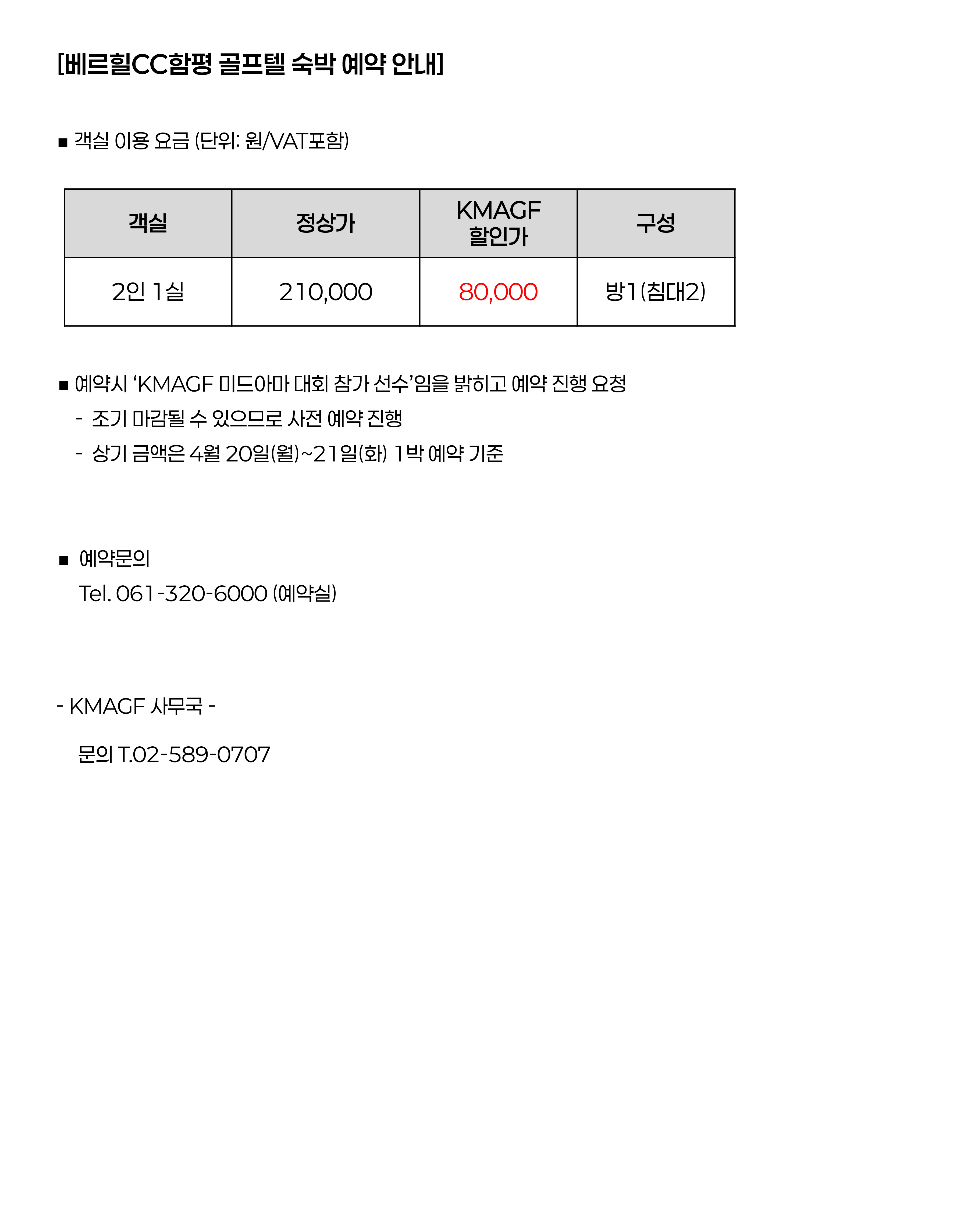 KMAGF 2026 정원 그린투어 1차전 - 베르힐CC함평 골프텔 객실 예약 안내